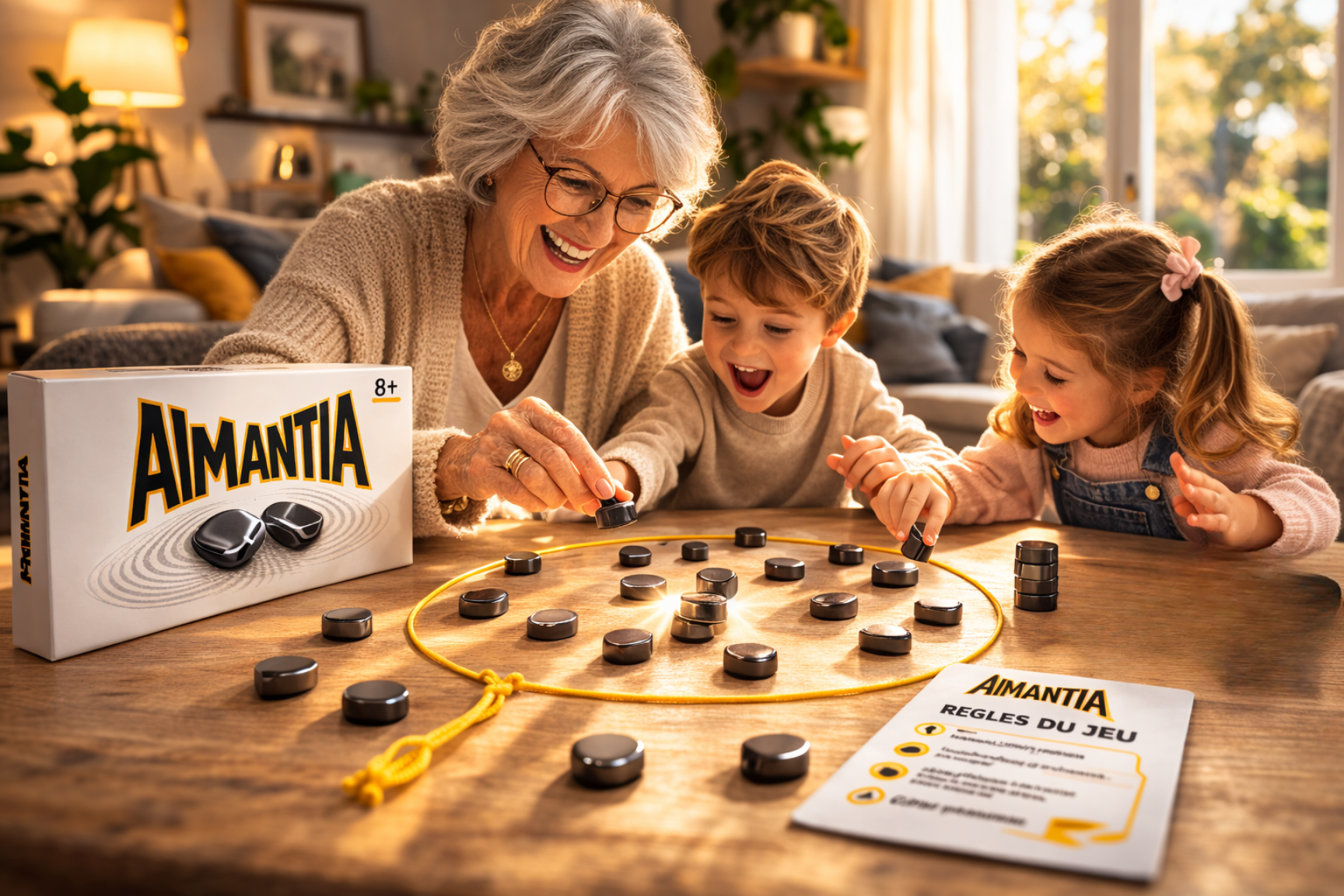 Aimantia convient aux enfants dès 9 ans, mais plaît tout autant aux adolescents et aux adultes. C’est un jeu intergénérationnel qui permet de passer du temps en famille, de développer la réflexion et de partager un moment ludique sans écrans.