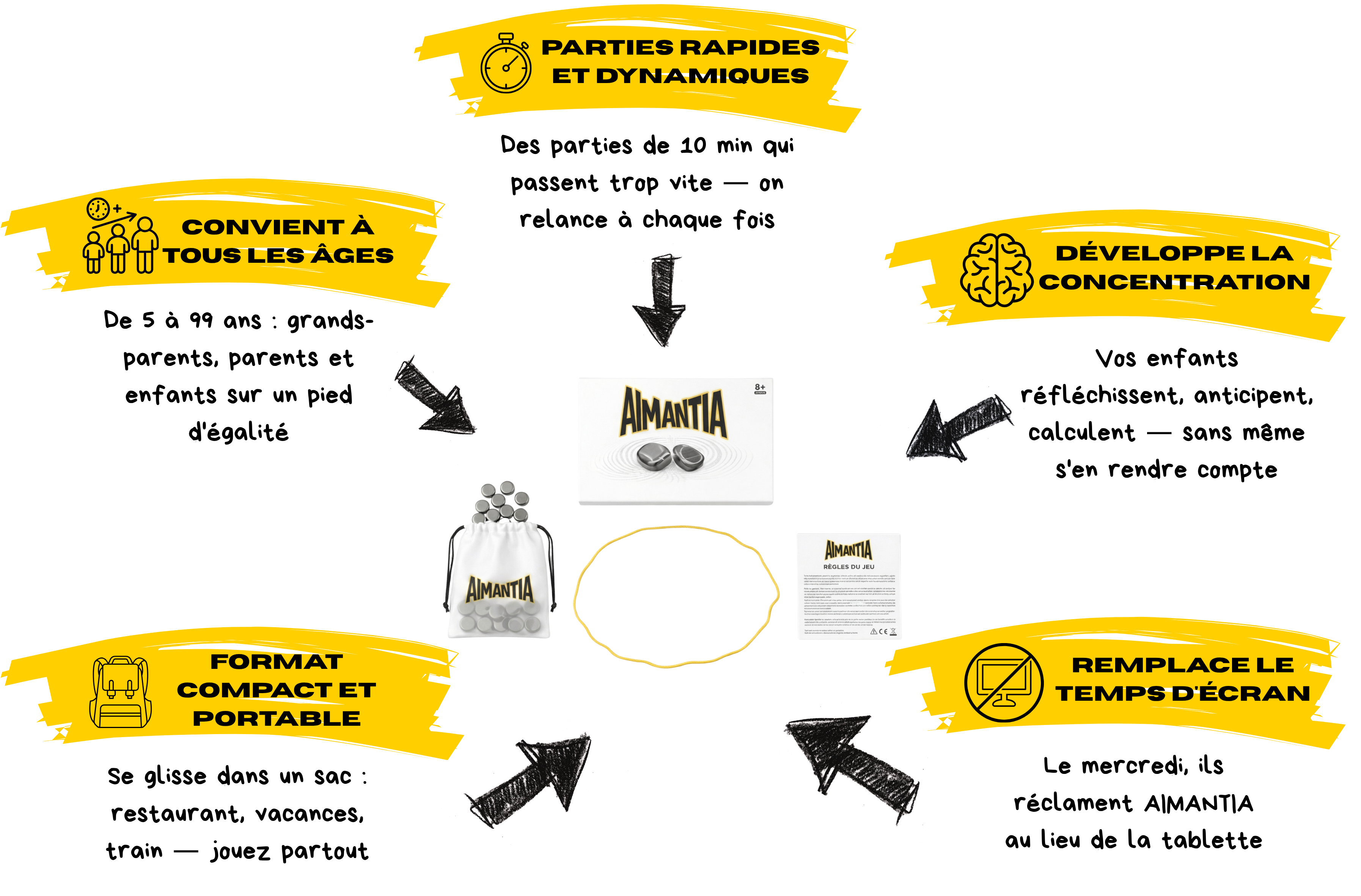 Aimantia est un jeu familial simple et stratégique conçu pour remplacer les écrans et rassembler parents, enfants et amis. Les règles sont faciles à comprendre : vous pouvez commencer à jouer en moins d’une minute. C’est un jeu rapide, intuitif et accessible à tous les âges.