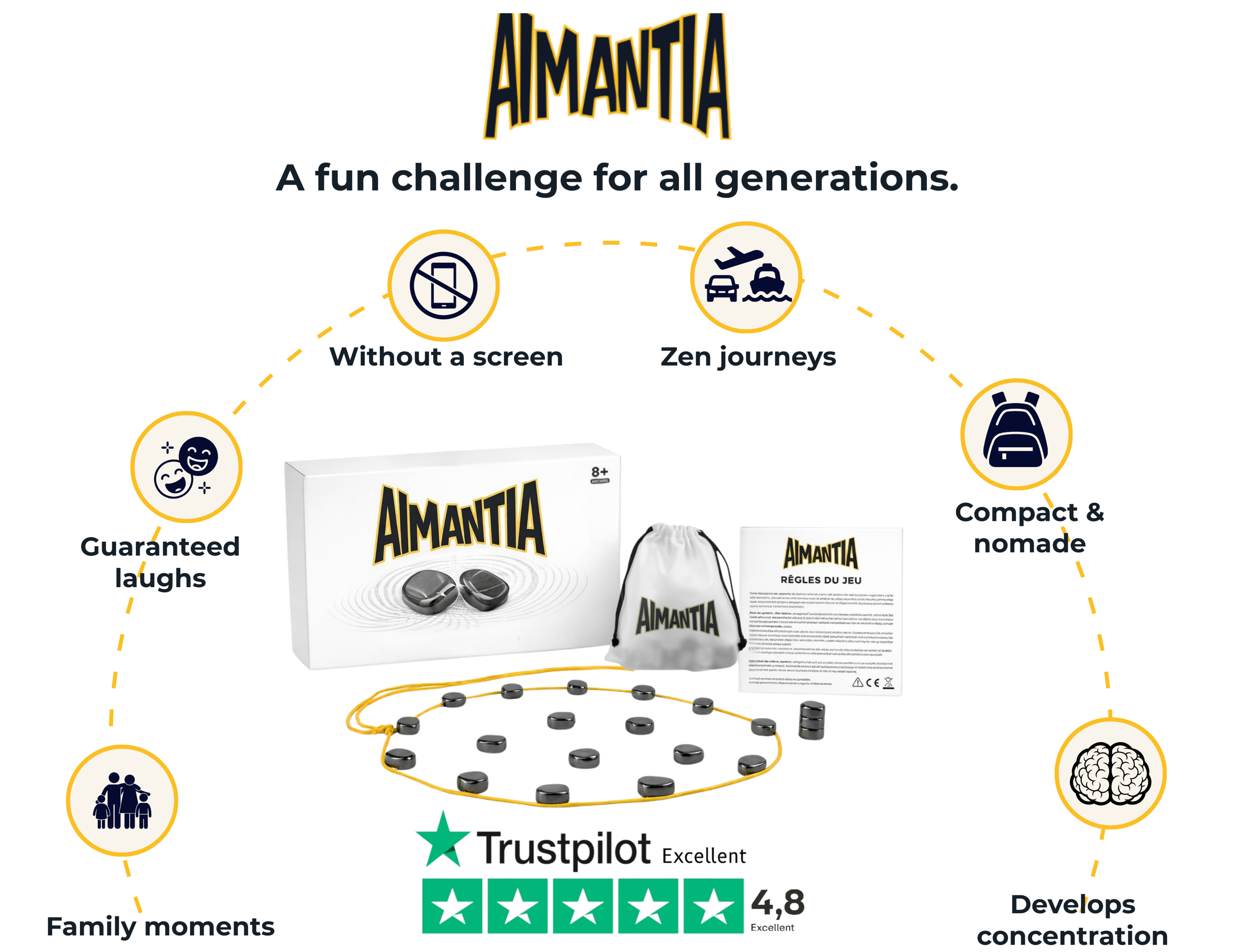 Aimantia is a simple yet strategic family game designed to replace screen time and bring parents, children, and friends together. The rules are easy to understand: you can start playing in under a minute. It's a fast-paced, intuitive game accessible to all ages.